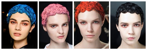 眾麻豆們頂著一頭五顏六色的“銅錢頭”現身T臺,讓人耳目一新,造型師把麻豆們的頭發完全貼頭皮盤繞成一小卷一小卷的發卷,然后再噴上藍色、橘色和粉色等顏色。