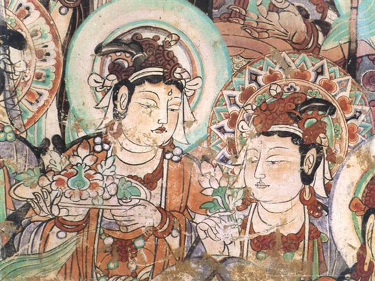 石窟里有神跡,也有凡俗,有佛國世界的浩瀚,也有世間百態的風尚。這里保存著十一個朝代的洞窟四百九十二個,彩塑兩千多樽,佛塑一千余身,其保存古代彩塑之多,歷時之長,技藝精湛。五萬多平方米的壁畫分為佛像畫、經變畫、民族傳統神話題材、供養人畫像、裝飾圖案畫、故事畫和山水畫。